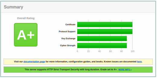Po reštarte urobte test SSLlabs znova a výsledkom bude krásne A! Teraz je server dobre nastavený.