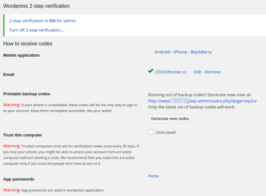 V dalším kroku můžete vyjmout váš počítač z ověření (důvěra na 30 dní, nedoporučuji) a ve třetím kroku můžete 2FA rovnou aktivovat. V přehledu nastavení doplňku je vidět e-mail použitý pro ověření. Můžete si zde také vytisknout záložní kódy (viz další odstavec).